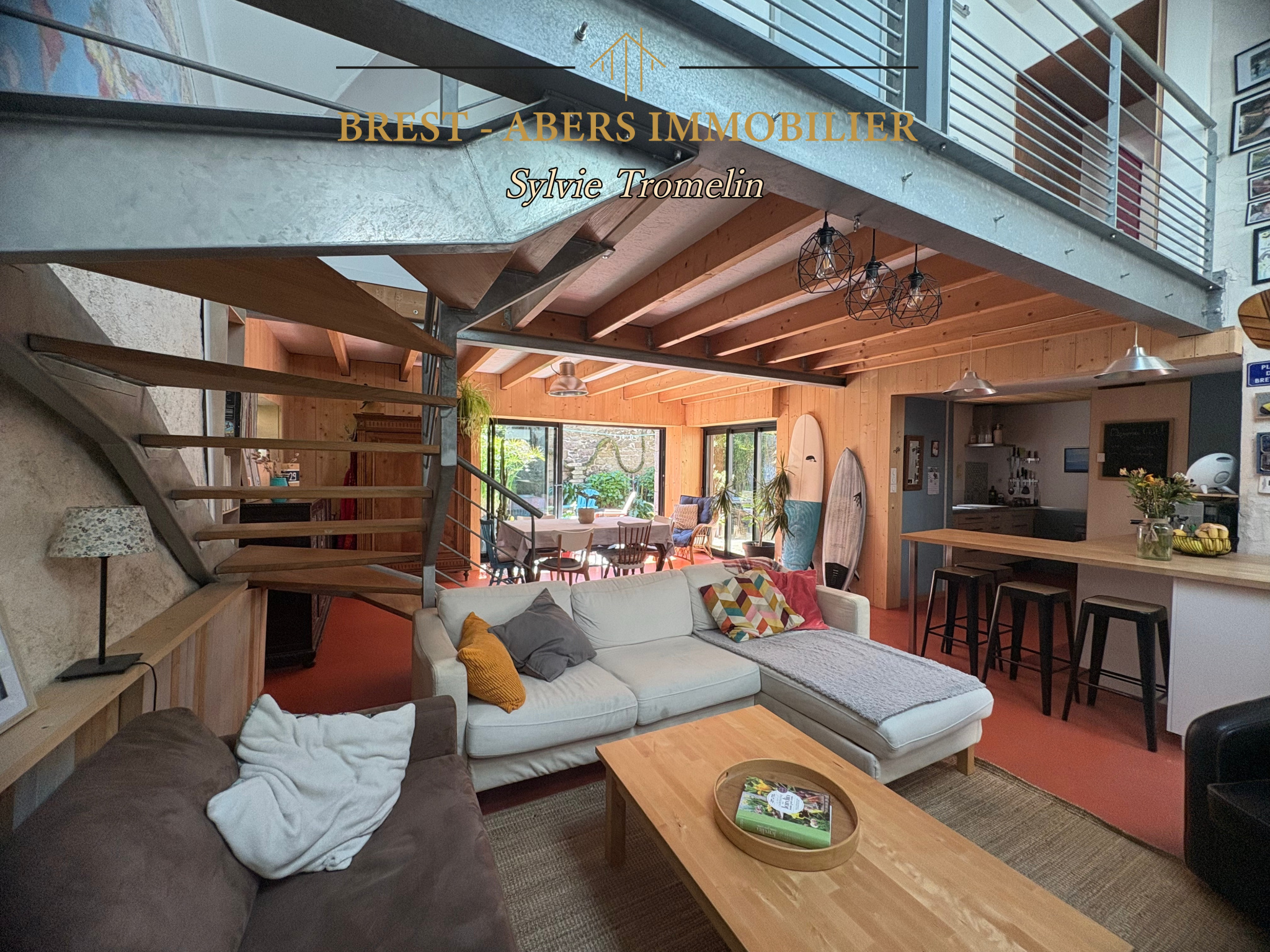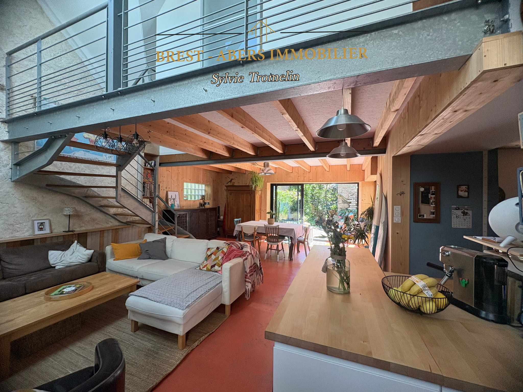 - L'aménagement pensé par une architecte, mettant en valeur la pièce de vie par sa hauteur sous plafond et sa cheminée imposante.