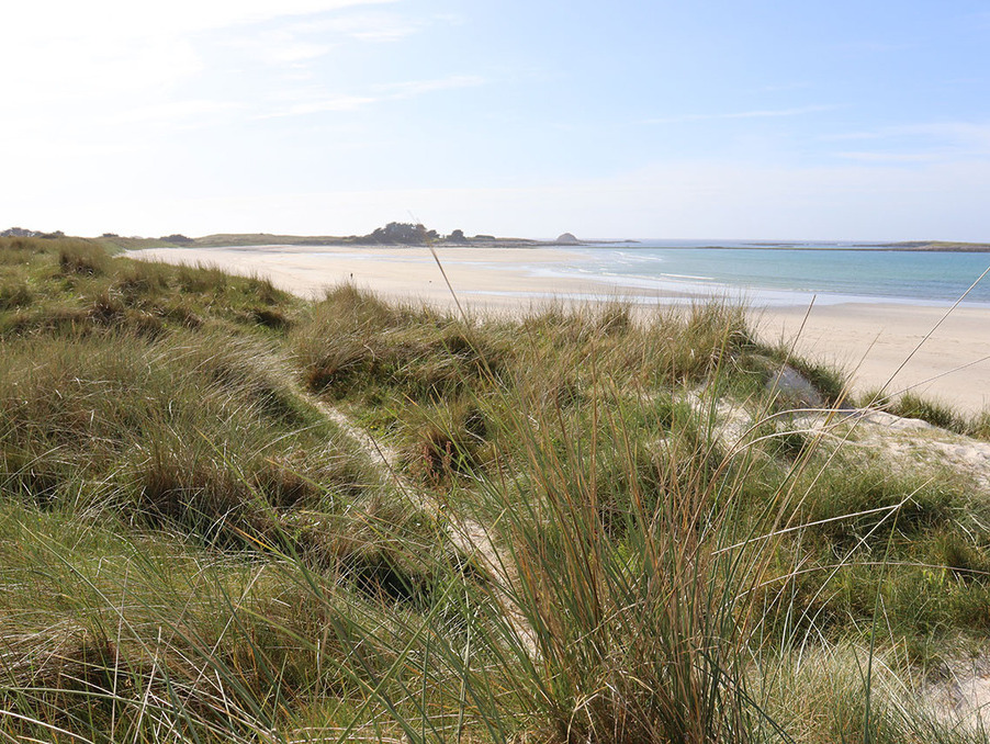 Située à Ploudalmézeau, dans le Finistère Nord, cette maison de 134 m2 offre un cadre de vie rare : un environnement préservé, face aux dunes de Tréompan et à deux pas de la plage. Son terrain clos et arboré de 2 519 m2, exposé plein sud, constitue un véritable havre de paix.